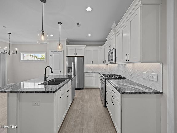 Entering the home, you're greeted with an expansive foyer detailed with inviting wainscoting, impressive molding detail, 9ft. ceilings, and an abundance of natural light. The home offers 3 bedrooms, with a split floorplan, and includes 2 full bathrooms downstairs. The sizeable bonus room over the garage, offers the home's 3rd full bathroom. The attached 2 car garage offers a built in storage/organization area sure to meet any handyman's needs. Granite countertops, tiled backsplash, gas range, and stainless steel appliances are any chef's dream. The center island welcomes many family gatherings and the open living area is perfect for entertaining guests. The living area is complete with a stone surround, gas fireplace and flat screen TV (to convey). Montevallo allows golf carts, which provides accessibility to nearby Ayden Golf and Country Club. Schedule your tour today - And witness for yourself, the many attributes of easy, peaceful living Montevallo has to offer!