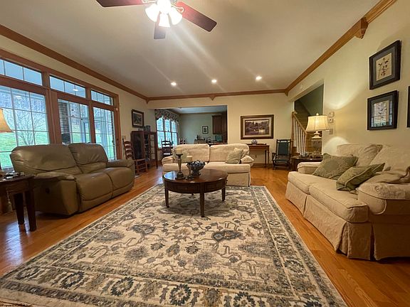Step into luxury living with this contemporary custom-built solid brick home nestled on 2.8 meticulously landscaped acres. A paved driveway leads you to a heated three-car garage, providing both convenience and comfort year-round. Inside, you'll be greeted by the timeless elegance of hardwood floors and tile throughout, accentuated by nine-foot ceilings adorned with wood molding. The main level boasts a primary suite offering privacy and relaxation, along with an additional bedroom or office for your convenience. Entertain guests in the spacious gathering room, featuring gleaming wood floors and two additional bedrooms for ample accommodation. Step outside to discover two outdoor areas designed for leisure and enjoyment—one with stone accents and a cozy firepit, while the other boasts a larger space adorned with pavers and another inviting firepit. Unwind in the comfort of a screened-in back porch, perfect for enjoying the outdoors without the hassle of insects. Situated in a convenient location near all city amenities, this home offers the perfect blend of luxury, comfort, and accessibility. Don't miss your chance to own this exquisite property—schedule a viewing today and experience the epitome of contemporary living.