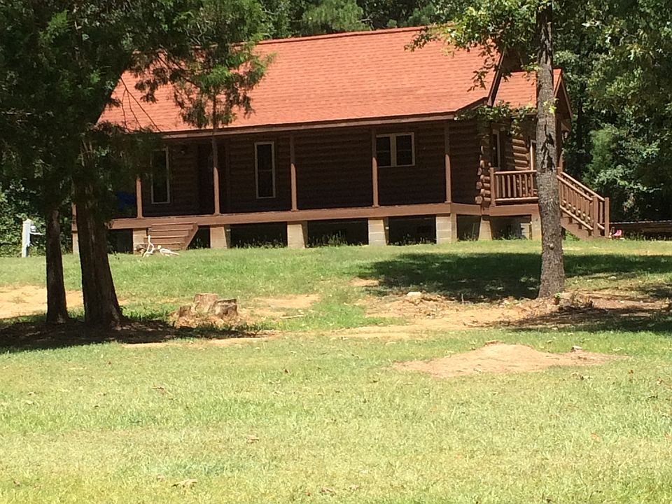 This is a beautiful log cabin. 2 bedrooms and 2 full baths downstairs with a 3rd room/loft upstairs. Galley style kitchen. Washer, dryer, dish washer and refrigerator come with the home. Hard wood floors throughout. The home has a front porch that stretches across the length of the home, perfect for rocking chairs and enjoying the peace and quiet. The kitchen door goes out to the side covered porch. The home is on 1 acre of cleared land. In the back is a large shed with electricity. The property is about 1 mile from a public boat ramp, and next to acres and acres of government woods.