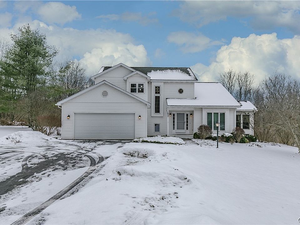 Fabulous floor plan in this Contemporary home located in the Town of Homer on 5 acres. Perfectly situated in a private location and just minutes to Route 81 and the Village of Homer. An open floor plan greets you from the foyer with a spacious living room with a wood burning fireplace. A well appointed kitchen with an island, peninsula counter seating and dining area which leads to sliding doors to a large, back deck. A formal dining room with walls of windows and skylights. The first floor also features a walk in pantry, office/den which has also been used as a fourth bedroom, half bath and laundry. The first floor master suite includes a spacious bedroom, master bath with marble flooring, walk in closet plus additional closet space. The second floor features an open bonus room which overlooks the living room on the first floor. Also a two bedroom suite with full bath. The partially finished basement has lots of potential for additional living space if needed and can be accessed through the home or garage. Five acres of beautiful property includes walking trails and an inground pool. See this special home and property today!