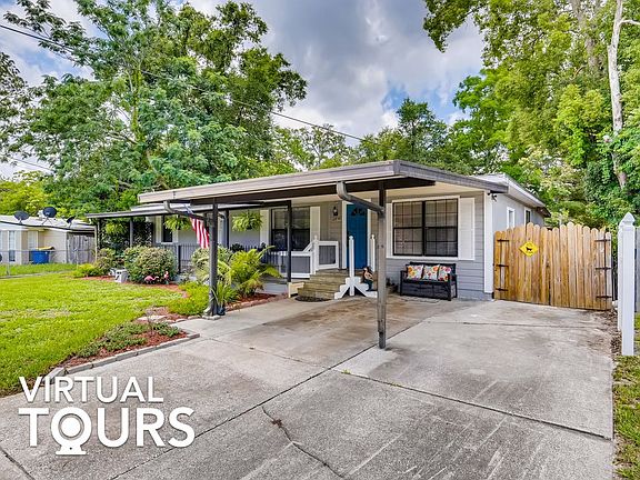 Charming 3 bd/ 1 1/2 bath ranch-style home with excellent updates in great North Jacksonville location. The front of the home has an excellent covered porch, with plenty of room seating and access to the front door. Upon entry, you are brought into the foyer with crown molding and into the main living area; it features a large ceiling fan and picture window, and leads onward into the kitchen. Whether you're a gourmet chef or a culinary minimalist, you will adore this eat-in kitchen -- it comes equipped with stainless steel appliances, plenty of counter space and handsome wooden cabinetry. The primary bedroom is very spacious; it has a small bonus room that attaches to the main space, and is very close to the shared bathroom, which includes a shower/tub combo, vessel sink and new fixtures. The last bath is a 1/2 bath that is also convenient to the back porch and pool. The secondary bedrooms are ideal for hosting guests, and could easily be used as a home office or creative space. A screened-in lanai is located directly off the back of the home; this spot is perfect for hosting and connects to the deck and above-ground pool. The backyard is a true entertainer's space, and is the optimal spot to enjoy the wonderful North Florida weather! Other features: driveway, bonus closet space in the laundry area, storage shed in back. Nearby: Jacksonville Zoo, Trout River, Menlo Park, local shopping and dining, easy access to I-295/95; short commute to downtown Jacksonville and the beaches. Buyer to verify all information.