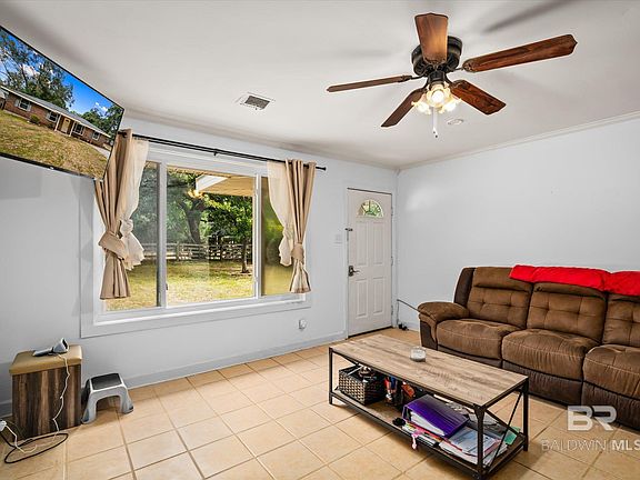Under the shade of the old oak tree stands a wonderful four-bedroom brick ranch that is just minutes from shopping, restaurants and I-10 which provides easy access to Mississippi, Mobile, Brookley and the Theodore-Dawes Industrial area. There is plenty of room in the circular drive to park several cars when family and friends come to watch the football game. When they do, invite them into the spacious natural light filled living room because the tile floor will withstand even the most exuberant fans. The living room is open to the breakfast area where casual meals can be lingered over and enjoyed while discussing the events of the day. The breakfast area flows seamlessly into the kitchen where granite countertops and lots of open and white cabinetry will make meal preparation a pleasure for the chef of the family. From the breakfast area, a door leads to the dining room that is totally encased with loads of windows. If a dining room is not needed, this room could be an office, den, game room, playroom – its usefulness is limited only by the imagination. The primary bedroom is off the living room and provides plenty of space for that quiet retreat at the end of the day. There is a half bath/laundry room combination that could accommodate a shower stall with a little work. On the opposite end of the home are three guest bedrooms and a guest bath located conveniently to the bedrooms as well as easily accessed by visitors. Tile floors extend from the living room, breakfast area, kitchen and into bathrooms while the rest of the home has laminate flooring – no carpet in this home. The home also features crown molding, bead board accents and double pane windows. When the game is over, head outside for a barbeque on the deck or patio and let the imagination loose for what type of activity the 3/4ths acre fenced property offers. There is an covered open area workshop for the handy person of the family to store tools and more.
