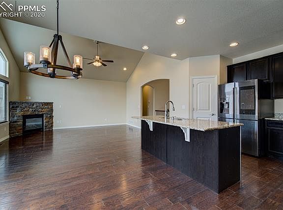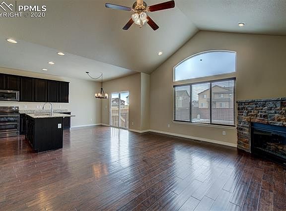 Welcome home to this beautiful home! Wood floors greet you at the entryway and flow through the main living area and master bedroom. Granite counters and stainless steel appliances with a WiFi enabled refrigerator make the kitchen a great place to entertain! The living room features a gas fireplace and the dining room walks out to the deck and the large backyard. There are two secondary bedrooms on the main level in addition to the laundry and master bedroom. A master oasis has beautiful hardwood floors, a double sided fireplace that opens to the master bedroom and the master soaking tub. There is a large shower, a double vanity, and a large walk in closet to round out the master suite. Downstairs there is a large living area, a wet bar with a mini fridge, two large bedrooms, a bathroom, and two large storage areas. The home has air conditioning for the hot summer days as well as new blinds throughout the entire home. It's within a short walk of the new school located in the neighborhood and is a short drive from Fort Carson, Peterson, and Schriever.