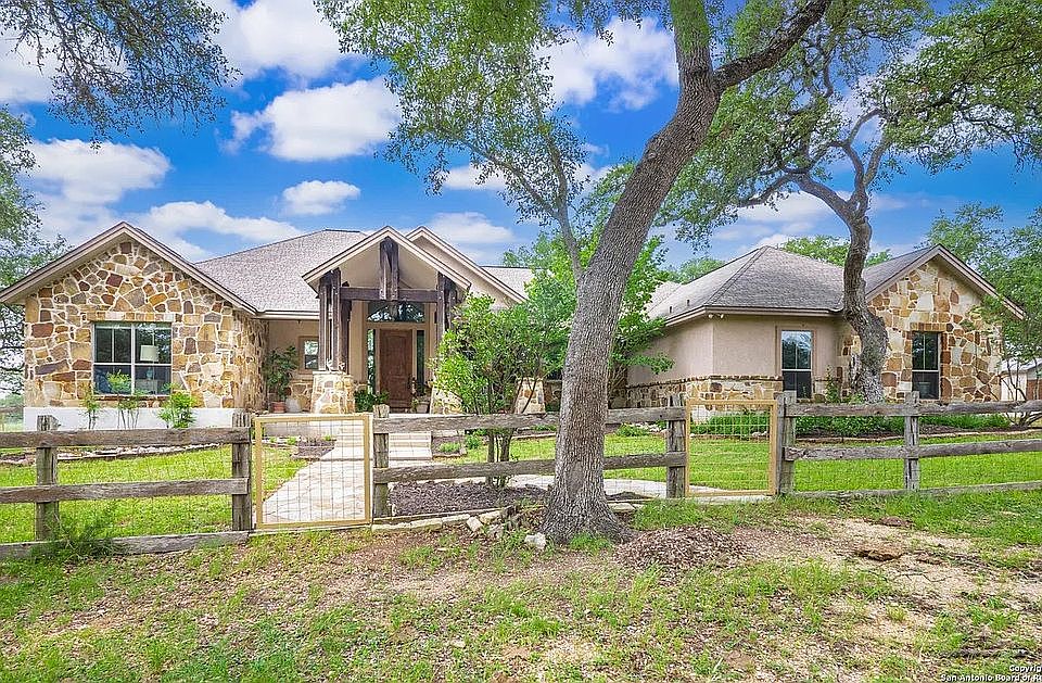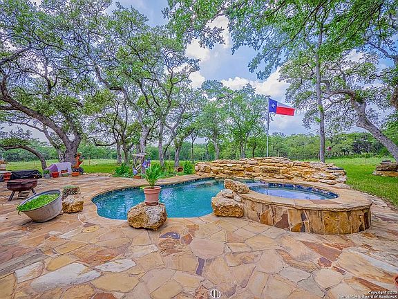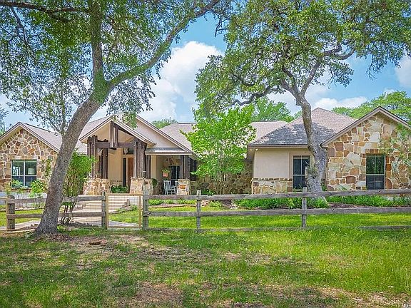 Welcome to your Hill Country retreat! Nestled on 25 fenced acres of mature oak trees and backing up to Rockwall Ranch with an AG exemption in place, this custom home offers all the privacy you could ever dream of. Step inside and be met with stunning cedar posts, high ceilings, rock accent walls and gorgeous wood floors throughout. You'll love cooking in the kitchen with its granite countertops, custom cabinetry and built-in entertainment center complete with a 65" tv. After dinner cozy up in front of the fireplace or take a dip in your resort style pool with waterfall and hot tub! The luxurious master suite includes an attached bonus room for gym, nursery or office. This home features a split floor plan consisting of 3 bedrooms, 3 bathrooms, a 4 car garage with full bath and office, plus an additional workshop/barn with another full bath! There's plenty of room for relaxing or entertaining guests. You will love this 25 acre oasis (hunting is allowed)! Feel like you're way out in the country but less than 20 minutes to major retailers and restaurants in New Braunfels and less than 30 minutes to downtown San Antonio. The property consists of 3 separate parcels of land. With this unique gentlemen's ranch, the opportunities are limitless! Open to selling the two smaller raw land parcels of 4.1 acres (A-183 SUR-363 M GALLARDO, ACRES 4.109) and/or 9.78 acres (A-672 SUR-362 J R WELSCH, ACRES 9.783) separately - make us an offer! Separate dog house near barn with air conditioning. For more information or to set up a walk through, please reach out to us directly.