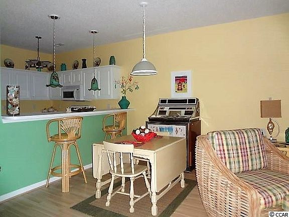 Cheerful beach colors welcome you as you enter this beautiful and well maintained 2 bedroom/2 bath condo. Conveniently located on the first floor there are no steps to navigate. Tile flooring extends through the foyer and kitchen. The kitchen has crisp white cabinets, a big breakfast bar with beautiful pendant lighting and comes equipped will all the appliances. Light laminate flooring extends through the spacious great room and dining area. Sliding glass doors open from the great room onto the 32' tile floored screened porch. A door off the screened porch allows for easy access to the backyard. There is even an attached storage closet for those beach toys. The master bedroom suite has French doors opening to the screened porch, walk-in closet and tiled master bath. The washer/dryer conveys with the sale. Heating and Air unit was replaced in August 2015. All this and located east of Bus. 17 in the lovely community of Seven Oaks. Seven Oaks is just a short golf cart ride to the beach, restaurants and all the activities offered. Most importantly, Seven Oaks allows owners to have golf carts!! Seven Oaks also offers owners and guests a community pool with sun deck, pool house, grilling area and pond in a park like setting. A wonderful condo and community for your new beach home.
