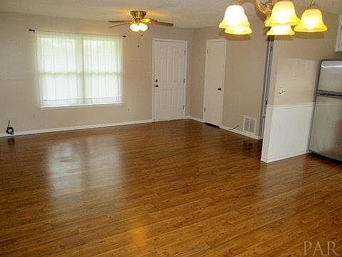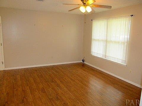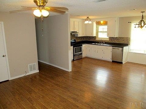 Extremely well maintained 3 bedroom home in preferred school district & only 2 miles from Navy Federal Credit Union's Corporate Campus. The attention to details is evident as you walk in the door, as this home has been very well maintained & updated in all the right places. You will immediately notice the Pergo flooring throughout, and the fresh paint. The kitchen/dining area features newly painted cabinets, a custom backsplash, and quality stainless steel appliances. There is plenty of cabinet space & plenty of room for a dining table as well. The dining area flows into the living area, with plenty of natural light through large windows, ALL of which were replaced after Hurricane Ivan! Down the hallway is the 2 guest bedrooms, and finally the master bedroom, with an over-sized closet & ceiling fan, and a doorway leading into the central bathroom. The bathroom features ceramic tile flooring & is centrally located in the home; very convenient to all bedrooms, with a shower/tub combo & over-sized vanity cabinet, with an upgraded countertop & bowl sink. There is also an attached 1-car garage, with laundry hookups & automatic door opener. Out back you will find an open patio & small storage shed. There is plenty of room for the children & pets to play, or to enjoy a backyard barbecue. The front yard is massive, with plenty of space & opportunity for landscaping, play areas, etc. Property is very convenient to I-10 as well. Additional upgrades include new architectural shingles roof installed after Ivan, new HVAC system installed, all windows upgraded since Ivan, new light fixtures. Home has been equipped with custom-fit aluminum hurricane shutters; mounting hardware is already installed.