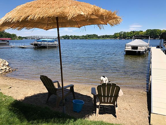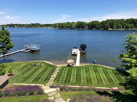 The Lake Life is calling! What an opportunity to own this beautiful lakefront home on the all sports lake, Big Long Lake. You can never have enough space at the lake and this home offers that with over a half acre of land, 100 foot wide lot, and the best walk-in sandy beach you could ask for. Enter into the home and see beautiful panoramic lake views through the many windows facing the lake. Gas fire places on both levels and oak hardwood floors throughout the main level. The completely renovated master suite offers a beautiful lakeview and the bathroom includes heated flooring, large soaking tub and a walk in tile shower. Downstairs in the walk out basement is a secondary kitchen and laundry area as well as 2 bedrooms and bonus room. Overlook the lake from the recently installed composite deck with stainless cable railing or the flagstone lounging terrace. Walk to the lake down the natural stone steps and you will notice the beautiful landscaping. Don't feel like walking up and down the steps? - then take the golf cart up and down the grass path for your convenience. Home offers lots of storage inside and out. Two storage sheds- one up and one down at lake level, 3 car attached heated garage, and 2 additional storage slots for boats in the Ramblewood backlot storage area. This lakefront lot in Ramblewood is at the end of the road and is adjacent to a neighboring wooded area which provides peace and quiet.