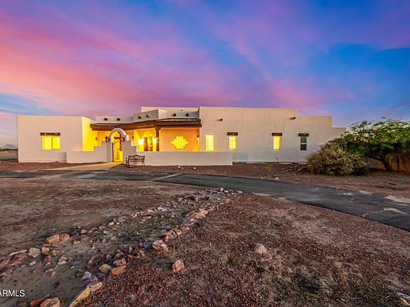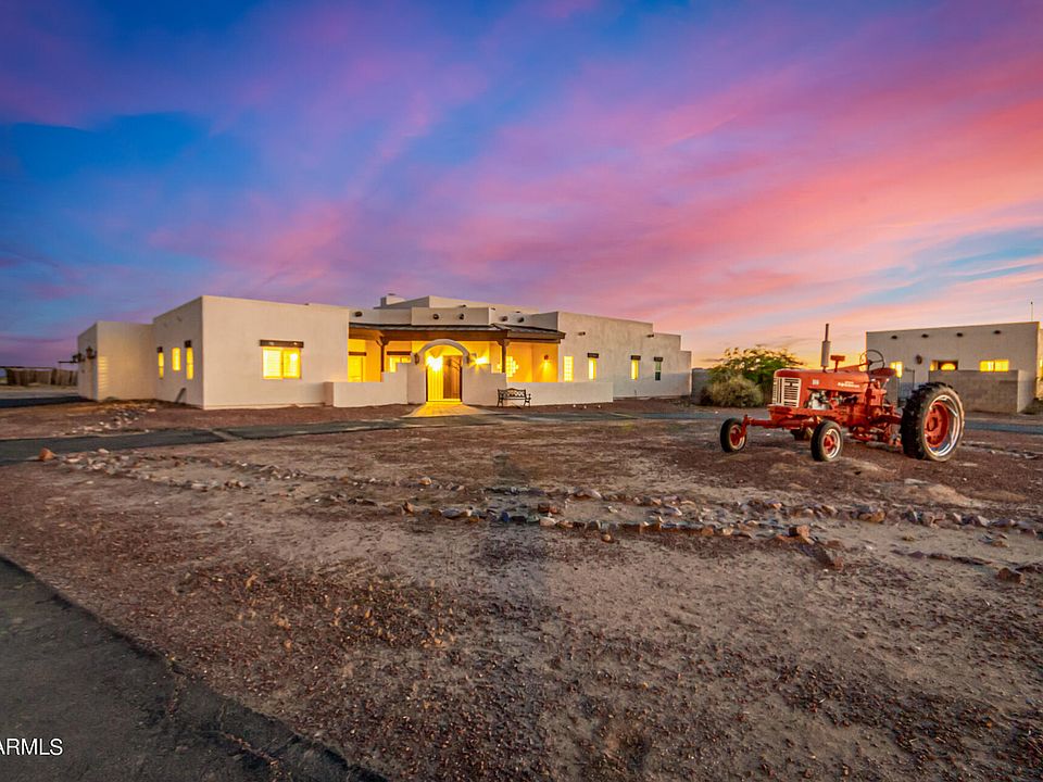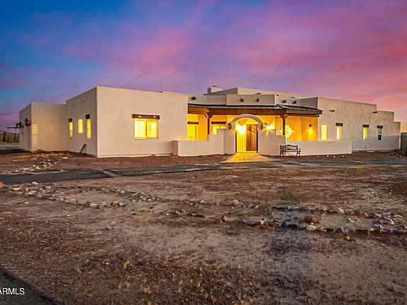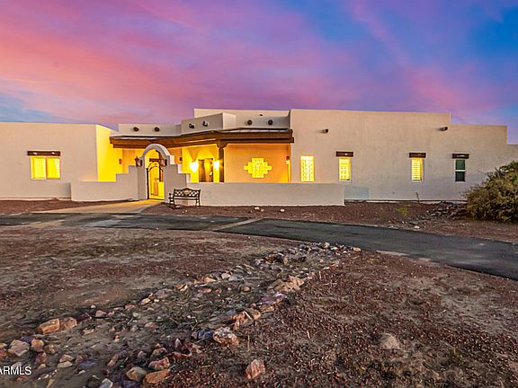 Custom home on 4.66-acre horse property in Eloy, featuring both a main house and a guest house/casita. The main house offers 3 bedrooms and 2.5 bathrooms, with an open-concept design including separate family and living rooms. The spacious kitchen boasts granite countertops, a large island, stainless steel appliances, and abundant cabinet space. The home features tile flooring throughout, two fireplaces, and stunning viga beamed ceilings. The oversized primary suite includes private patio access and a luxurious bathroom with a separate shower, soaking tub, and dual sinks.