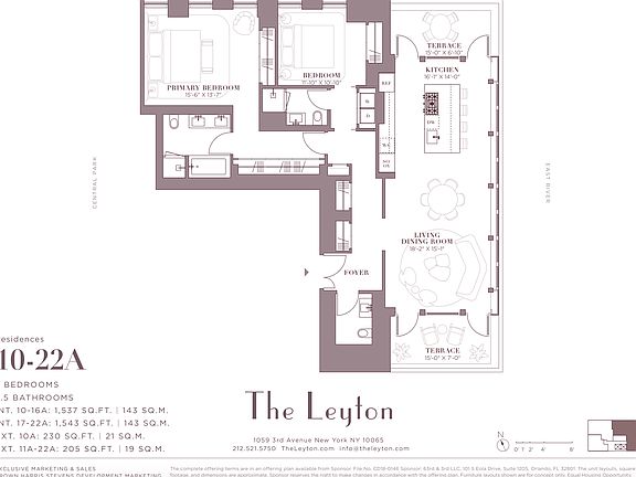 Brand New Building! No Board approval! Crisp and contemporary, airy and elegant, this sophisticated, spacious two bedroom, two and a half bath residence blends the peerless elegance and thoughtful proportions of Manuel Glas Architects and the tailored, visionary interior design of Elena Frampton. Impressive ceiling heights, floor-to-ceiling windows and two outdoor terraces offer stunning city skyline views in this dignified residence in the heart of Lenox Hill. A handsome, welcoming foyer with exquisite herringbone white oak flooring and abundant closet space leads to an expansive great room drenched in natural light. Framed by a wall of east-facing windows, the seamlessly blended living space bathes in natural light all day. The great room is anchored by two North and South facing covered terraces with lovely Manhattan views. Clean lines and considered functionality define the custom Poggenpohl kitchen, with its huge marble waterfall island/breakfast bar and integrated Gaggenau appliances. A natural extension of the kitchen, another adjacent covered terrace faces east and north, allowing for daylong al fresco dining. With a custom marble mosaic floor and Aged Dark Nature marble slab walls, a custom powder room rounds out this unparalleled common area. Thoughtfully tucked away, the private quarters embody the pinnacle of comfort and sophistication. Reached via a long hall of closet space, the palatial primary suite is bright but tranquil, thanks to floor-to-ceiling performance windows. The ensuite, marble-clad bathroom features dual vanity, a soaking tub and separate shower hydronic, radiant heat floors underfoot. The similarly spacious second bedroom offers ample storage space and a spa-like ensuite bathroom. Sitting in the heart of Lenox Hill, The Leyton provides immediate access to the world-class dining, culture and shopping that the Upper East Side is famous for. Access to Central Park is on your doorstep, and public transportation options abound. Renowned for her palatial approach to the world's most luxurious hotels, two floors of entertaining space were designed by Alexandra Champalimaud, and offer indoor and outdoor dining and entertaining options with 270-degree skyline views. The Leyton models a culture of service with a 24-hour attended lobby and a global concierge service available to service your every need. Amenities including a state-of-the-art fitness center, private storage, bicycle storage, a Paw Spa and a dedicated mail and package room are but a few of the luxuries included in this extraordinary building.