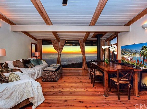 Perched on high hillside in Laguna Beach, the staggering views from this property span over the whole town and over the Pacific Ocean to Catalina Island. With the sea breeze blowing in every room, this charming three bedroom is the perfect place to live on permanent vacation or to getaway to out from the hustle and bustle. The contemporary styled home has a nice coastal flare with wood beamed ceilings, hard wood floors, and Spanish tile. There are three bedrooms in the main house and a quaint studio below with a bedroom and full bathroom which can be used as a separate rental. The West facing house is light and bright with lots of windows. Enjoy glorious evening sunsets from one of the three decks/patios or from inside the house. Drive five minutes to downtown Laguna Beach where one can soak up the sun on the pristine beaches, eat out at a fine restaurant or healthy café, and shop the trendiest boutiques and art galleries. This property is sure please and definitely a must see!