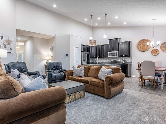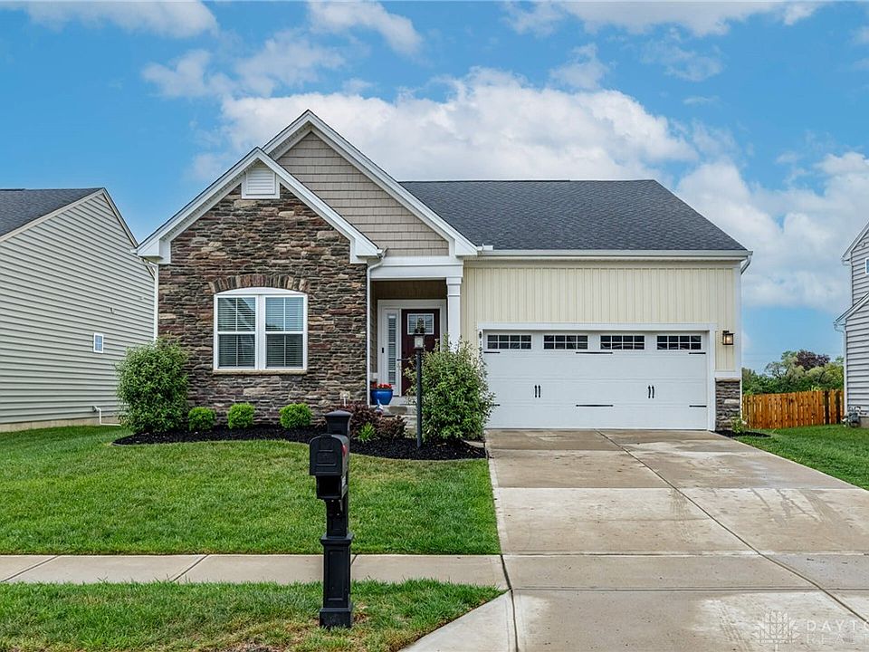 Built in 2019, this beautifully maintained home offers a convenient commute to Dayton, Columbus, and WPAFB. Step inside to a spacious, open-concept layout featuring vaulted ceilings in the kitchen and main living areas that enhance the airy, modern feel. The home boasts 3 bedrooms, including an inviting owner's suite complete with a large walk-in closet and an oversized shower. Enjoy serene views of the community pond and surrounding green space right from your backyard deck. A full basement adds plenty of storage, a full bath rough-in, work out area or future living space potential. This home truly blends comfort, style, and convenience.