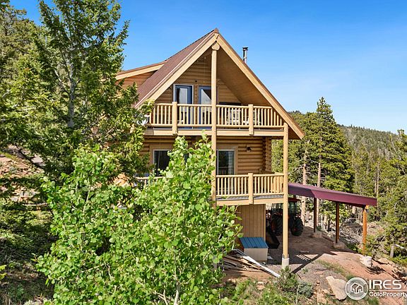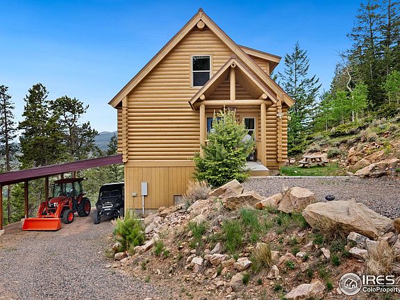 Soaring high, this home has expansive views. A custom log cabin on 2 acres provides ample entertaining space, sleeping space, and privacy. Walk out basement has 10-foot ceilings. With 4 bedrooms and 3 baths, this home welcomes you and asks you to stay awhile. Lots of space for guests offering two living spaces for wiggle room. Wood accents, beamed ceilings, six-panel doors, knotty Alder cabinetry, soapstone wood burning stove, trex decking, radon mitigation system, new carport, and more. Turnkey living. Most furniture will be conveyed with a Personal Property Agreement. On a well and full septic. 4th bedroom (non-conforming) has endless possibilities. Oversized, covered deck off the main living area and private balcony off the primary bedroom. Plenty of closet space and storage/workshop area in the basement. Observation platform & firepit area plus abundant rock outcroppings & hiking trails to enhance your outdoor experience. Nicely maintained exterior with a newer standing seam metal roof & graveled driveway plus 2 large (10 x 12 & 10 x 8) sheds for toys/tool storage. The grassy, "play" space next to the house is the perfect spot for picnics or outdoor games. Crystal Lakes is home to 7 stocked, private bodies of water and miles of trails to hike and explore with close proximity to Roosevelt National Forest. The true Colorado lifestyle is yours for the taking in this YEAR-ROUND HAVEN - don't let it get away.