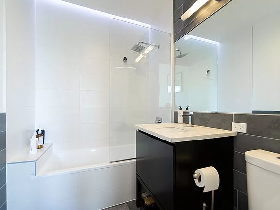 Panoramic city skyline views greet you as you enter this gorgeous two bedroom two bath condo located in vibrant Greenpoint with. This fifth floor unit is west facing and features stunning light all day with gorgeous city sunsets to enjoy all year round. Super low taxes via the 421a tax abatement in place with 10 years left. The entrance opens to an expansive eat in kitchen with Bosch appliances and beautiful quartz countertops. As well as tons of cabinet space for all your kitchen storage needs. The living room is connected off the kitchen with space for a dining area or an expanded living room setup. Floor to ceiling windows greet you in the living room and both bedrooms. A secondary/guest bathroom is well placed next to the kitchen and living room with a walk in shower and rainfall style shower head. Two outdoor spaces provide ample private outdoor space from the secondary bedroom and living room that open up to a massive private terrace while the primary bedroom features it's own terrace perfect for sun bathing. Two large bedrooms offer work from home flexibility depending on your needs. The primary bedroom has ample space to fit even a king sized bed comfortably as well as walk in closet. A large bathroom is connected directly off the primary bedroom and features a deep soak tub. The secondary bedroom can do double duty as a guest bedroom or a home office or both! Amenities include central A/C HVAC system, washer/dryer hookup. Oak wood floors throughout. The building features keyless fob front door entry, elevator, as well as a bicycle room in the basement. Take the elevator to the roof deck for even more incredible New York City views from One World Trade all the way up to the Empire State building and the UN. There's also plenty to love in the low monthly common charges and 421a tax abatement in place for low over head costs in a high end building. Located just steps from the Greenpoint water front, shops and dining on Franklin Street, and transportation via bus and subway on Manhattan Avenue as well as a short walk to LIC. Don't miss out and attend one of our open houses or schedule a private viewing today!