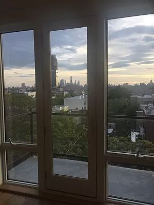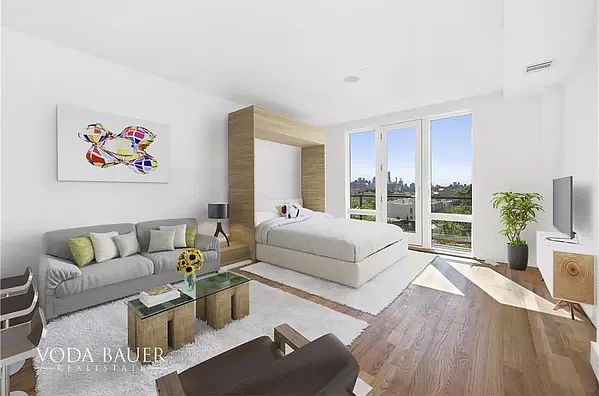 Best and Brightest Studio, this one-of-a-kind corner home is unique to the building. Enjoy 2 exposures in this unit - open south facing views from both the kitchen and the bathroom as well as stunning western Manhattan skyline views with glorious sunsets off the balcony. This apartment features floor-to-ceiling windows, solid oak hardwood floors, modern kitchen with open layout, ample cabinet space with hydraulic closure, generously sized countertop, high-end stainless-steel appliances and dishwasher. In-unit washer & dryer and spa-inspired shower with a deep soak tub and frameless glass enclosed shower with a rain-style shower head. Pre-wired Bluetooth speaker system, central heating & air conditioning system. Hi-speed internet options include: Fios and cable. The lobby has video security and a double-door key-fob entry system, state of the art elevator that is high-speed yet quiet, with a bike room and a storage room in the basement. 1059 Manhattan Avenue boasts one of the best rooftop 360 panoramic views of New York City including the Brooklyn Bridge, Queensborough Bridge, East River and Manhattan,. Located in the heart of Greenpoint Brooklyn, the building is 2 blocks away from the river front and steps to the G train. Within easy reach of fine dining, shopping, leading cultural institutions, and non-stop recreational opportunities. A new water taxi stops conveniently between India and Java streets, connecting Greenpoint to the rest of New York City. (Please note: Floor plan is missing the windows in the kitchen and bathroom)