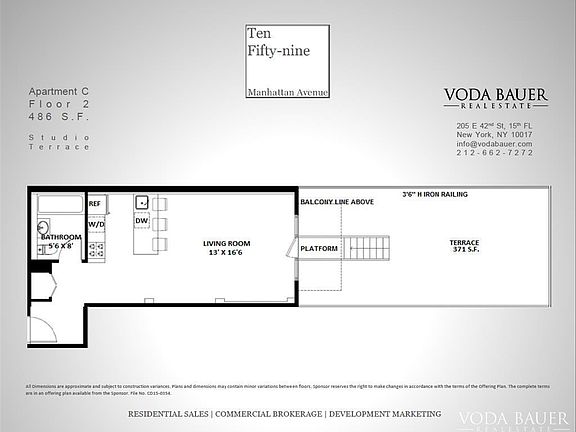 Located on the second floor in a brand new stunning and modern building, this studio is exquisitely crafted with gracious layouts and thoughtful attention to materials and finishes. The residence unfolds and the sun sets upon a spacious light-filled living room with floor-to-ceiling windows and natural oak hardwood floors throughout. Stunning kitchen features hydraulic cabinets, high-end stainless steel appliances, and washer and dryer hook-up. Bathroom offers a serene environment with floors and walls wrapped in porcelain and Burlington tile, and enjoy deep soak tubs and frame-less glass enclosed showers with rain-style shower heads. It also has 371 Sq. Ft. private terrace where one can relish the sunrise every morning. From prewired speakers to individually controlled central air conditioners, this apartment is the perfect space to realize your modern design vision. 1059 Manhattan Avenue is a small-scale building that ensures close-knit surroundings with grand-scale amenities: common roof deck offering panorama city views of downtown Manhattan, a stunning lobby with video security and double-door key-fob entry system, state of the art elevator that is high-speed yet quiet, with a bike room and storage rooms in the basement. Located in the heart of Greenpoint, a cozy neighborhood in Brooklyn, the building is 2 blocks away from the river front and steps to the G train. Within easy reach of fine dining, shopping, leading cultural institutions, and non-stop recreational opportunities. A new water taxi stops conveniently between India and Java streets, connecting Greenpoint to the rest of New York City. For more information, please check or contact us for .
