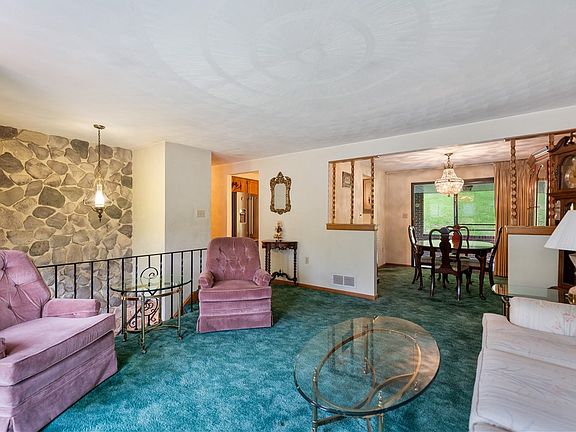 WELL CARED FOR SPLIT, VAULTED ENTRY WITH STONE ACCENT WALL. Featuring hardwood floors throughout. Bright open living room & eat-in kitchen w/updated stainless appliances. Formal dining room with glass doors to the 20 ft covered porch that offers wooded views. There are 3 bedrooms all with hardwood floors and double closets. A finished lower level has a 20 ft game room w/fireplace. An additional storage room and a laundry room with extra storage. It's also plumbed for a bath. A spacious garage rounds out the lower level. The long double driveway makes for easy turn around and extra parking.