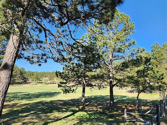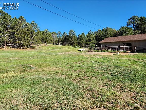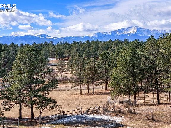 A truly special midcentury beauty ready for your vision! Over 2,500 square feet tucked on 2.8+ acres that is perfectly treed and meadow located in sought after south Black Forest with Pikes Peak views. Zoned for horses. Multi-purpose outbuilding with 1,400 square foot, insulated, electric and water that is currently set-up as three animal stalls w/ runs, a dog run, a finished bunk house w/ wood stove and workshop/additional garage w/ wood stove. Additional 2.75+ acre lot bordering that is owned by the seller and can be purchased which would be perfect for a multi-generational situations or future investment. The one owner home has gorgeous wood beamed vaulted ceilings throughout the main level and oak hardwood floors beneath all of the carpet on the main level just waiting to be uncovered for the first time. Freshly painted interior and a new 50 year metal roof installed in 2023. The living room is flooded with light from the large windows which give serene views of the surrounding towering Ponderosa Pines, a beautiful moss rock stone wall surrounding the wood stove and the wall as you enter the front door. Spacious wraparound covered deck and secondary lower deck are perfect for outdoor entertaining. Spacious dining room w/ hardwood floors and a beautiful bay window. Primary suite w/ private deck and a private bath. 3 bedrooms, an office and 3 baths. Bright kitchen w/ tons of cabinetry and an eat-in breakfast nook. The kitchen could easily be opened to the great room. Lower level family room w/ gas fireplace and brick surround with a walk-out to the sunroom w/ a hot tub. Large covered parking area w/ concrete pad perfect for storing boats or RV's out of the elements. Storage shed. Zoned for horses and other animals w/ a fenced pasture featuring a heated automatic waterer. No HOA. Award winning School District 20. This is the best of both worlds - the opportunity to live on beautiful acreage but only minutes from the best amenities, shopping and restaurants.