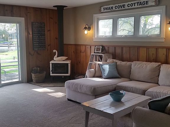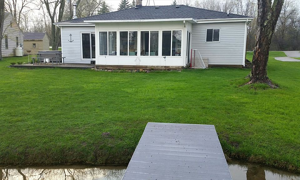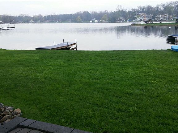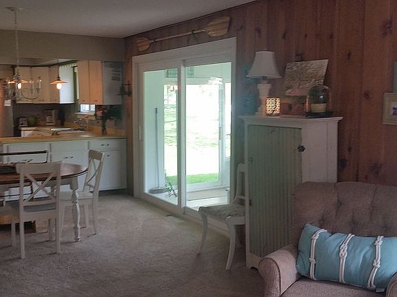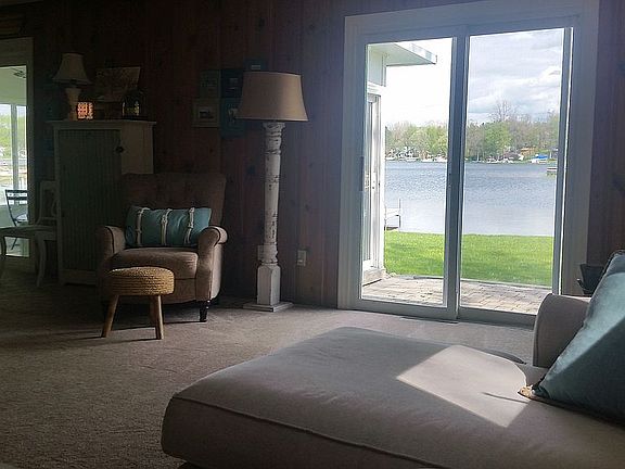 Cozy home located on private all-sports Runyan Lake. 2 bedroom, 1 and 1/2 bath on 50 ft. Of Sandy bottom frontage. Large deep lot with white picket fencing and a dog door into the garage. Open floor plan attaching the kitchen, dining, and living areas with open water views from each. Recently updated home, New: roof, sumo, HVAC, lighting, windows, siding & insulation, remodeled kitchen. The garage was recently rebuilt with a new driveway, walkway, and patio. New wood burning stove in living room on a natural slate hearth for cozy winter nights.