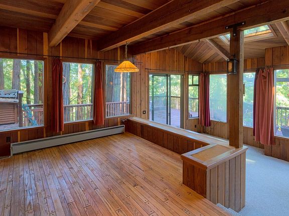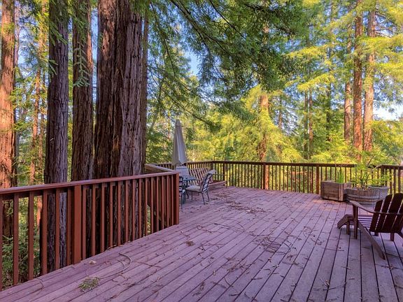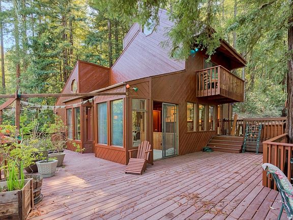 Serene, surrounded by redwoods, 2 car garage, unique windows through out to enjoy the outside views, redwood kitchen counter top and bathroom counter top, loft/bonus room, open concept. Plenty of parking to entertain your guests with great indoor outdoor living, including beautiful views from the massive deck. Sunken tub in the master en suite bathroom, which also includes double sinks and a very unique round window above the tub. Nearby Ben Lomond community--market, coffee shop, Italian restaurant, hardware store, new bakery and the world famous Henflings!