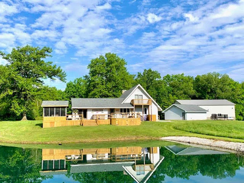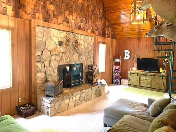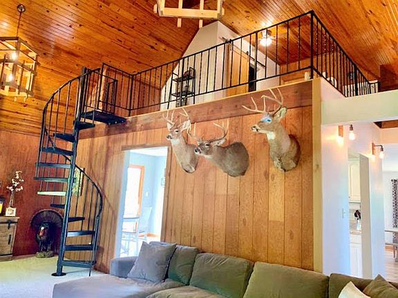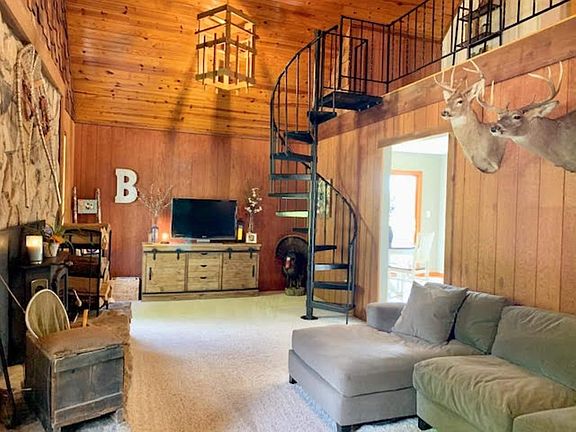 Country dream home perfectly nestled away from the hustle & bustle on 6.41 acres. 40x60x16 heated pole barn w/ concrete floor & insulation, 3 car heated garage, stocked pond, & a gigantic back deck w/screened in porch & hot tub w/ views that make you feel like you are on a vacation getaway. The living room feels like a ski lodge w/soaring wood ceilings & a wood burning FP perfect for chilly, cozy nights. Upstairs, the BR has a private balcony, walk-in closet, full bathroom, & a loft. The master is large w/ French doors to the deck, & a huge w-in closet. New flooring, paint, water heater, upstairs bathroom, & tons of other updates plus a 1 year home warranty give peace of mind. Located in a USDA 100% financing eligible area.