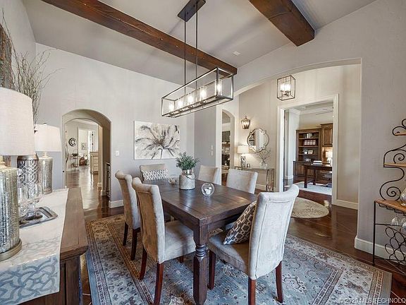 Cul-de-sac! 5 Bed/4 full bath home in Bixby North. Master & Guest Down, 3 beds & 2 full baths upstairs. New paint, lighting, carpet. Stained concrete floors, SS appliances, granite counters. Butlers pantry w wine refrigerator, 10ft doors, wood beams in dining & entry. Upstairs game room w/ wet bar & vaulted pool room w wood beams. Double sided FP in master. Outside patio w/ arbor & wood burning FP. Rock retaining wall w/ newly stained & refurbished fence. Large 3 car garage. 2 walk in attics. Owner/Agent.