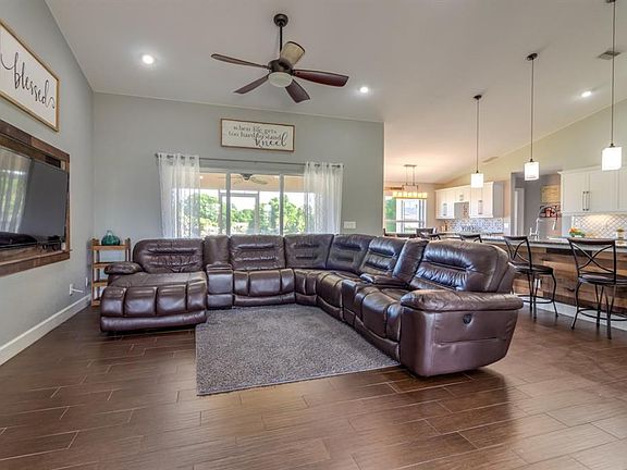 If you like tranquil water views then you picked the right one! Expansive water views from almost every room in the house. This Beautiful 4 Bedroom (Or 3 Bedroom and Den) 2 Bathroom Home has the spacious wide open floor plan you are looking for. This home shows like a model and yet makes you feel "at home" the moment you walk through the double door entry. Porcelain Wood Plank Tile floors flow throughout the split floor plan capped off with 5 1/4" baseboards. A Large kitchen with highly sought after White Cabinets and a nearly 10' massive grey granite topped island, stainless steel appliances, farmers sink and gorgeous backsplashes await. Watch the sun set over the water from the dining room, or eat outside while watching the fish jump and birds play from an almost 300 sqft lanai. Had a long day? Let the stress melt away as you soak in the freestanding tub or get massaged from one of the master shower panel systems. Both bathrooms have vessel sinks with modern faucets. The guest bath has a stunning marble/stone wall that complements the shower tiles. The Master shower is an HGTV must see! The Beautiful grey tiles are accented by one of a kind glass/metal mosaic strips. Did I mention the 14'x6'master closet!! Wood plank accents and granite window sills, it has it all. This is truly the house you always wanted on the lot you have always been looking for. Don't let this house become someone else's home, see it today and make it yours. Plus it's X-zone so flood insurance is currently not required.