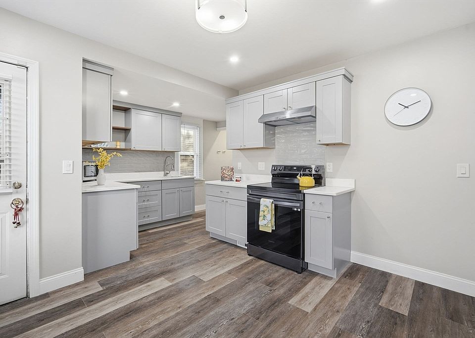 Renovated kitchenOpen floor planVinyl flooringOpen staircaseFreshly updatedFreshly painted interior