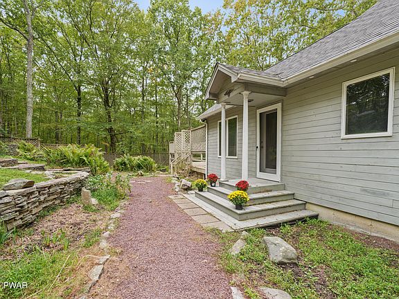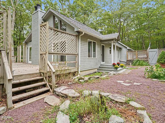 DISCOVER YOUR PRIVATE SANCTUARY IN THE HEART OF THE POCONO MOUNTAINS. The moment you turn onto the long, winding driveway, you'll feel the stress of the outside world melting away. This thoughtfully designed approach not only ensures maximum privacy but also builds anticipation as you continue towards your new home on this ultra-private lot. As you step into the heart of the home, you are greeted by beautiful hardwood floors that flow seamlessly throughout the main living spaces & cathedral ceilings,. The living room is anchored by a charming stone fireplace, creating a cozy focal point perfect for gathering on cool evenings. This home's versatile layout features a convenient bedroom and a full bathroom on the main floor, making it ideal for a guest suite, home office, or single-level living. Upstairs, the private primary bedroom features an en-suite bathroom, providing a comfortable and secluded personal retreat. The lower level offers an additional bedroom with its own bathroom, a perfect space for extended guests or a private living area. A dedicated storage room on this level provides ample space to keep the home organized. Outside the home you will discover a truly exceptional outdoor living space. A large, wrap-around deck provides multiple vantage points for relaxation, outdoor dining, and entertaining. In front of the home, a beautiful multi-tier garden with a serene koi pond creates a picturesque and calming backdrop. A separate shed provides plenty of space for gardening tools and outdoor equipment. To complete the home is a one-car attached garage for convenient access and secure parking. Surrounded by nature yet close to Milford's amenities, it offers the perfect balance of serenity and convenience. You are just minutes from downtown Milford's shops and dining, as well as I-84 for easy commuting. Community amenities include security, a clubhouse, tennis courts, an outdoor pool, a beach area, a gazebo, & boat launch. DV Schools.