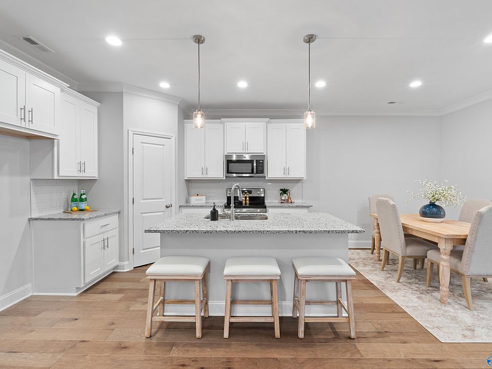 - Features: 9’ Ceiling, Crown Molding, Eat-in Kitchen, Kitchen Island, Pantry, Recessed Lighting, Smooth Ceiling, Quartz