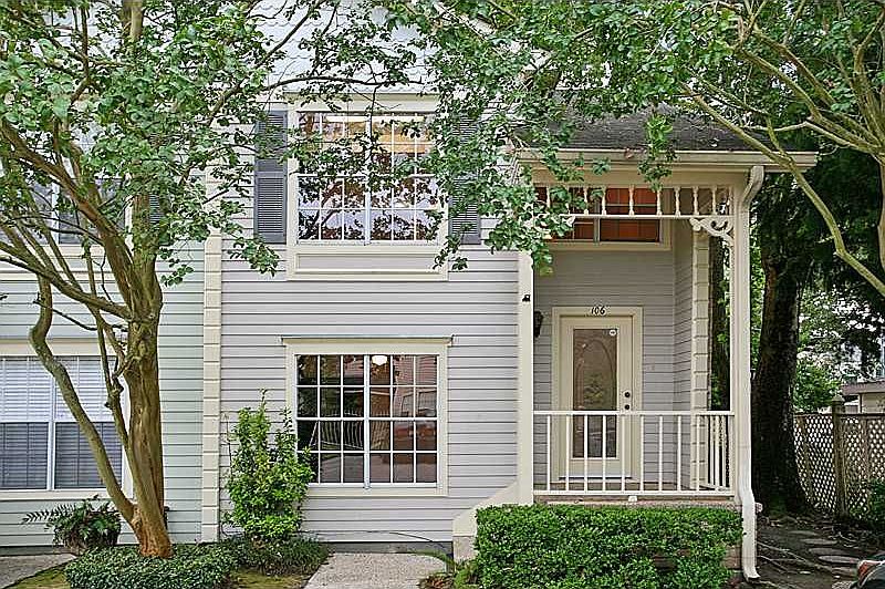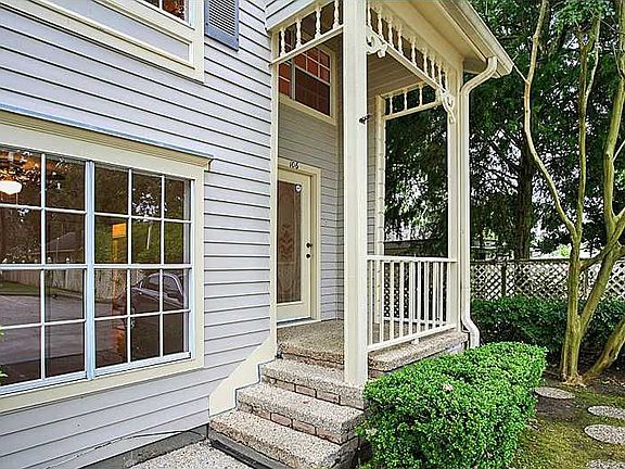 Delightful townhouse style condo on private corner location. Attractive Victorian porch leads to 2 story foyer with soaring cathedral ceilings in living/dining, 17' brick wd burning fireplace & Brazilian cherry wood floors. Kitchen amenities include granite counters, new appliances, & oak cabinets. Impressive master bed w/ access to the garden/patio, renovated bath w/walk in CA closet & whirlpool tub. 2nd bed includes a custom built-in bookcase.
