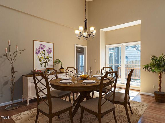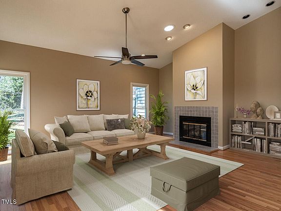 Terrific ranch walking distance to downtown Cary! Lovely real hardwood flooring in the main living areas plus two secondary bedrooms. Contemporary plan with vaulted ceiling and lots of windows plus solar tubes for a light & bright interior. Gorgeous screen porch with vaulted bead-board ceiling and fan, plus lots of open deck for grilling and sunshine. Kitchen with laminate flooring, 42'' white lacquer cabinets, pull-out shelving, and gas stove. New carpet in primary bedroom, plus walk-in closet and double vanity. New vinyl windows throughout! All new interior paint! Ceiling fans in every bedroom. Oversize two-car garage with workbench and storage. Nice wood privacy fencing surrounds private back yard. Cul-de-sac location.