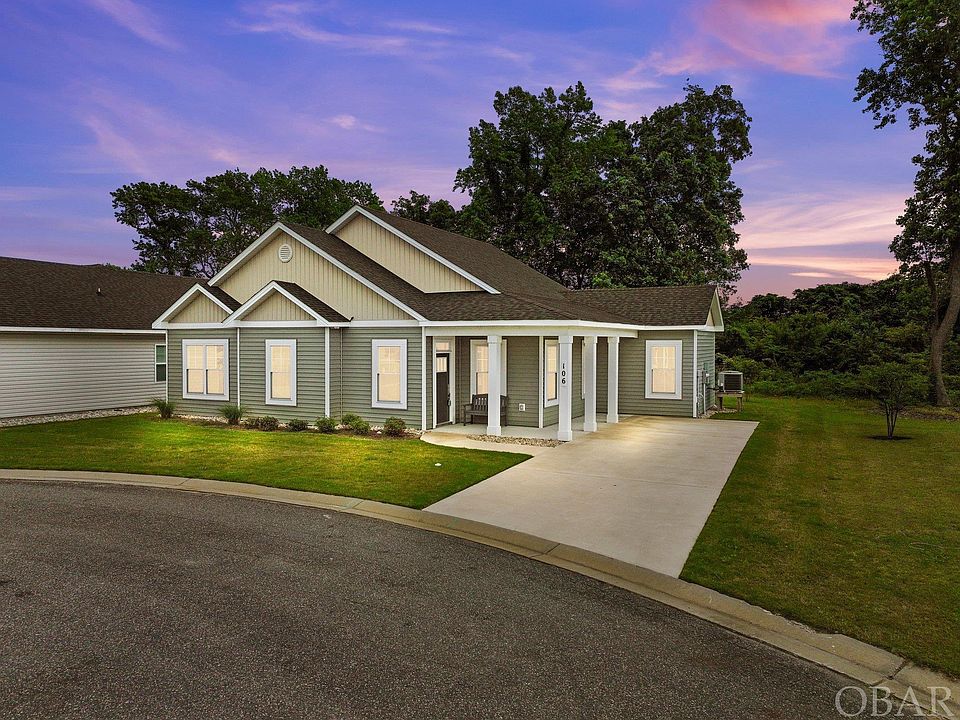 WELCOME HOME to the Winsome plan. This coastal cottage with a side front porch features an open concept design with volume ceilings to create a spacious and airy feel. The generous living room greets you upon entering and flows into the dining room. The chef inspired kitchen adjoins the dining room and features an island, stainless steel appliances and custom tile backsplash. Enjoy relaxing or entertaining on your rear patio directly off the dining area. The bedroom corridor provides privacy and features two secondary bedrooms with large hall bath and oversized laundry room with cabinetry for home organization. The primary bedroom is tucked at the rear of the home and provides a large walk-in closet, ensuite luxury bath with semi-custom tile shower and dual sinks. Interior detailing includes LVT flooring at main living areas, carpet at bedrooms, tile flooring at baths, custom cabinetry, solid surface countertops, DELTA plumbing fixtures, craftsman trim package, and designer lighting package. An attached storage room provides space for your outdoor supplies and beach toys! Situated on a beautiful, wooded cul-de-sac, this unique property will not last long! Waterside Villages is a gated community with resort style amenities that include clubhouse, swimming pool, shallow water marina, community pier and picnic pavilion. Conveniently located 12 miles from the OBX beaches, Waterside Villages is in the heart of Grandy and near three public golf courses and only minutes to local shopping and restaurants. Home is professionally staged and furnishings and decor do not convey. Seller is a licensed NC Real-estate Broker. Taxes based on land only. Buyer to pay one time capital contribution fee of $925.00 at closing.