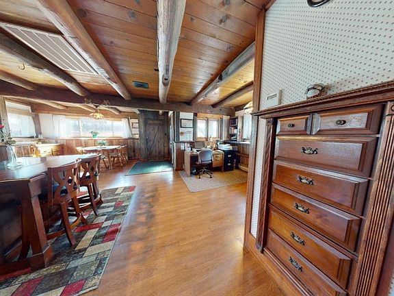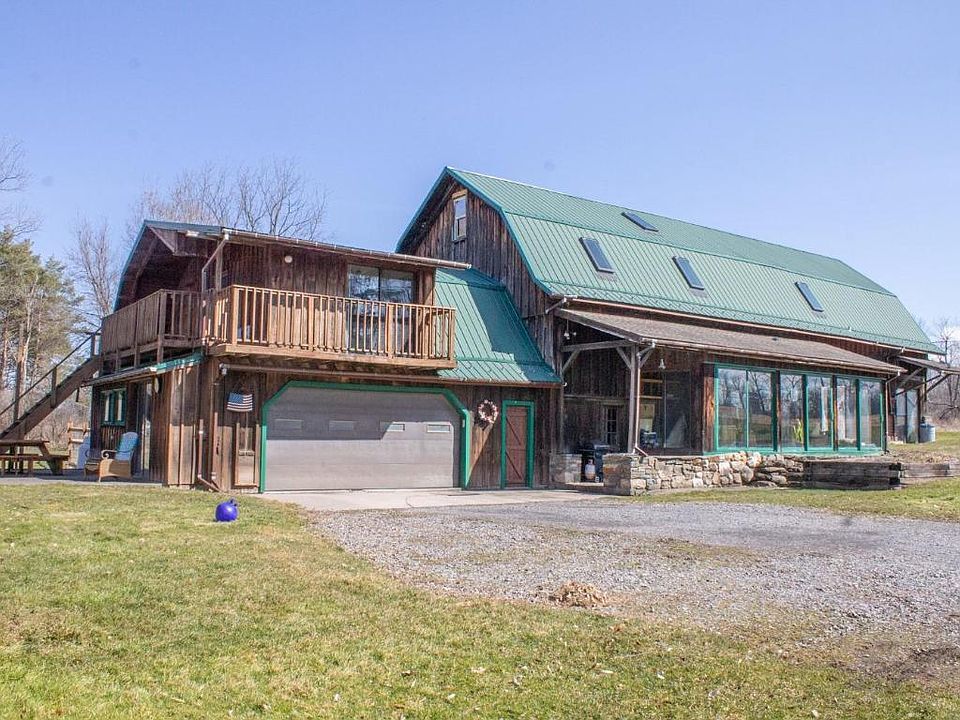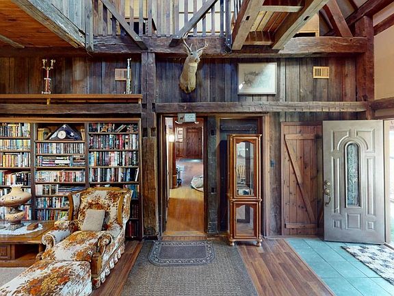 Country living at its best! Perfectly situated on just over 19 acres with a pond, sits this unique converted barn style home. Plenty of outdoor yard space with invisible fence for dogs, as well as a smaller fenced in area. Enter through the mudroom into the open floor plan kitchen with eat in kitchen island and formal dining area. Relax on the oversized front sun porch as you enjoy the nature around. The exposed wood beams throughout give that rustic feel. Main floor features a library/additional living space with built-in bookshelves, oversized laundry room with ample storage. Upper level features an additional living room with 2 bedrooms and a bonus room. Master bedroom connects to a full bathroom with a whirlpool tub. Additional bedroom could be a master bedroom or an in-law suite. Lots of possibilities with this home.