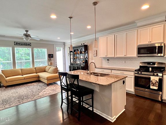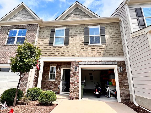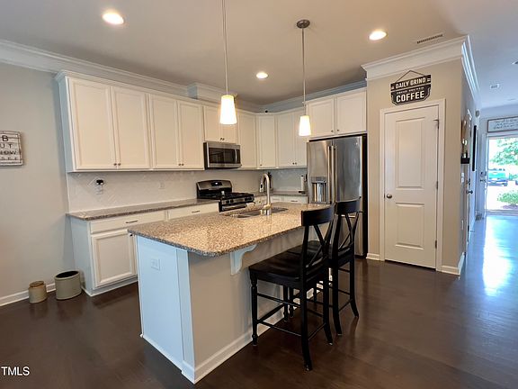 Welcome to this exquisite townhome in the Woodcreek community! Only 10 minutes from the heart of Holly Springs, 15 from downtown Apex, and 30 from downtown Raleigh, this home is perfectly located with much to offer its residence. Having only one owner, this two story middle unit was built in 2017 on a premium lot backing up to the woods providing serene and private views from the living room, owner's suite, and backyard patio. This home is full of designer touches and modern amenities. The open concept living area is perfect for both entertaining and everyday life, featuring nine foot ceilings, double crown molding, and hardwood floors throughout the first floor. The kitchen features white cabinets, granite countertops, and a stylish tiled backsplash. The appliances are stainless steel and include a gas range, french door refrigerator, and a vented microwave. Retreat to the owner's suite, where a tray ceiling adds a touch of sophistication. The owner's bathroom offers a spa-like experience with a luxurious walk-in tiled shower, tile flooring, and a double sink vanity. Ceiling fans in the great room and owner's suite ensure comfort year round. Recent updates include a new air conditioning unit 2023 and exterior paint job in 2023. Park right across the street. This quiet and vibrant community is walkable and has amenities that will elevate your lifestyle with a pool featuring a waterslide that lands into a lazy river, tennis courts, basketball courts, pickle ball, workout facilities, and a beautiful clubhouse. Come and tour this desirable property before it's gone!