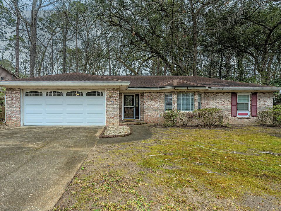 Classic 1-story ranch home, great location & neighborhood. Roomy lot & back yard, mature foliage. The back deck - in disrepair - could again be a spectacular outside living space wrapped around the big live oak. Great usage options for the outsized, wired 2-room shed/workshop. The home's front living room opens to a separate dining space. The private master bedroom suite w/recently renovated bathroom is split right. A central kitchen opens to den/family space featuring tongue & groove wood walls, fireplace, and sliding doors to the back deck. The 2nd & 3rd bedrooms are split left. The 2nd full bath has an exterior door to the deck, as well. Hard surface floors throughout, serviceable or renovate if desired. Extra storage cabinets/space in 2 car garage. All appliances convey. Welcome home!