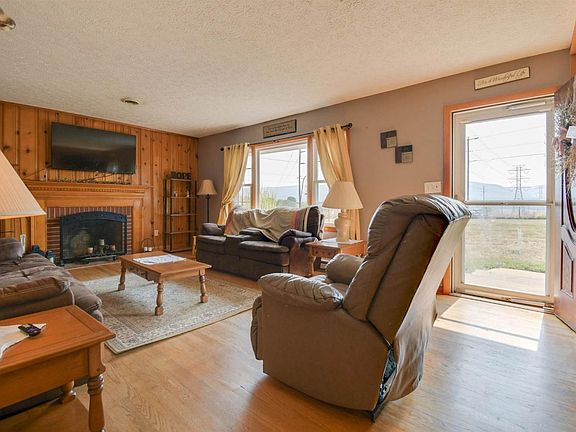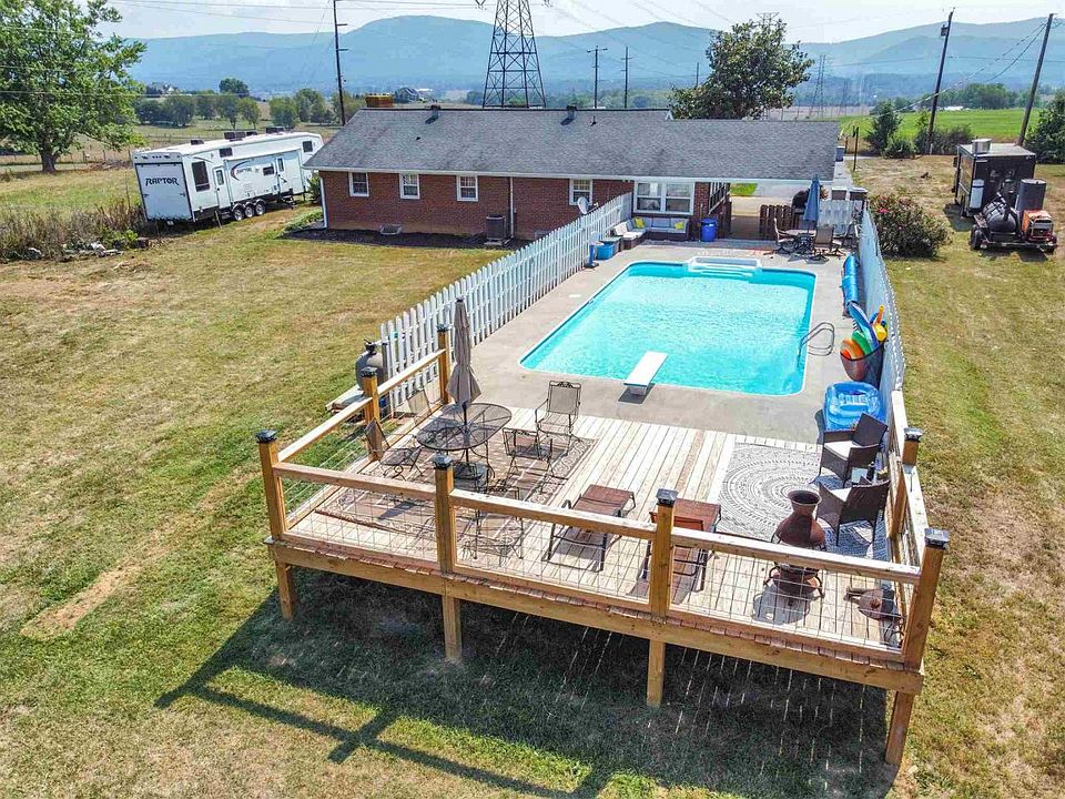 Great home with mountain views and the added bonus of having your very own pool. Over one acre in the county. Cozy sunroom, main level has oak hard wood floors throughout and a wood burning fire place. Three beds and one and a half bath on main floor. Downstairs basement is split in half, one side is storage & laundry, other half is rec area with fireplace & full bath. Plug in your motorhome or rv to the 50 amp rv service off of the carport. Level yard, 2 storage buildings, & a brand new deck added to expand your space for relaxing by the pool.