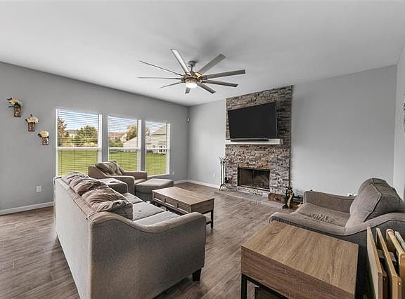 2-year old RANCH IS READY. This 3 bdrm, 2 bath home has AN OVERSIZED, AMPED UP 3-CAR GARAGE (Quatro Stacker Heavy duty car lift. Heaters that service a 4 car garage. Wi-Fi, battery backup garage door opener. Commercial grade ceiling fan w/remote. 1500 lb winch/hoist.) It's a must see, for sure! Fully insulated for starters. All the modern touches from gray floors to black wrought iron light fixtures. MAIN FLOOR LAUNDRY with a boot-bench and divided bdrm floor plan for privacy. Cozy wood burning fireplace is centrally located to warm the open floor plan. Stand at your kitchen island and look over the dining area and living room! Step outside the sliding glass door to a LARGE level lot (.423 acres). Imagine grilling out there in the Spring and watching the dogs run! The lower level has a rough in for a 3rd full bath and PLENTY of room to make it your own. Can't say enough about this one! MUST SEE. Sellers are looking for an ASAP closing, if possible.