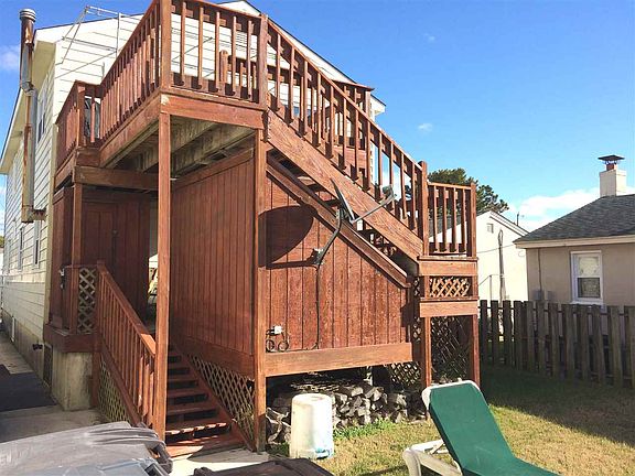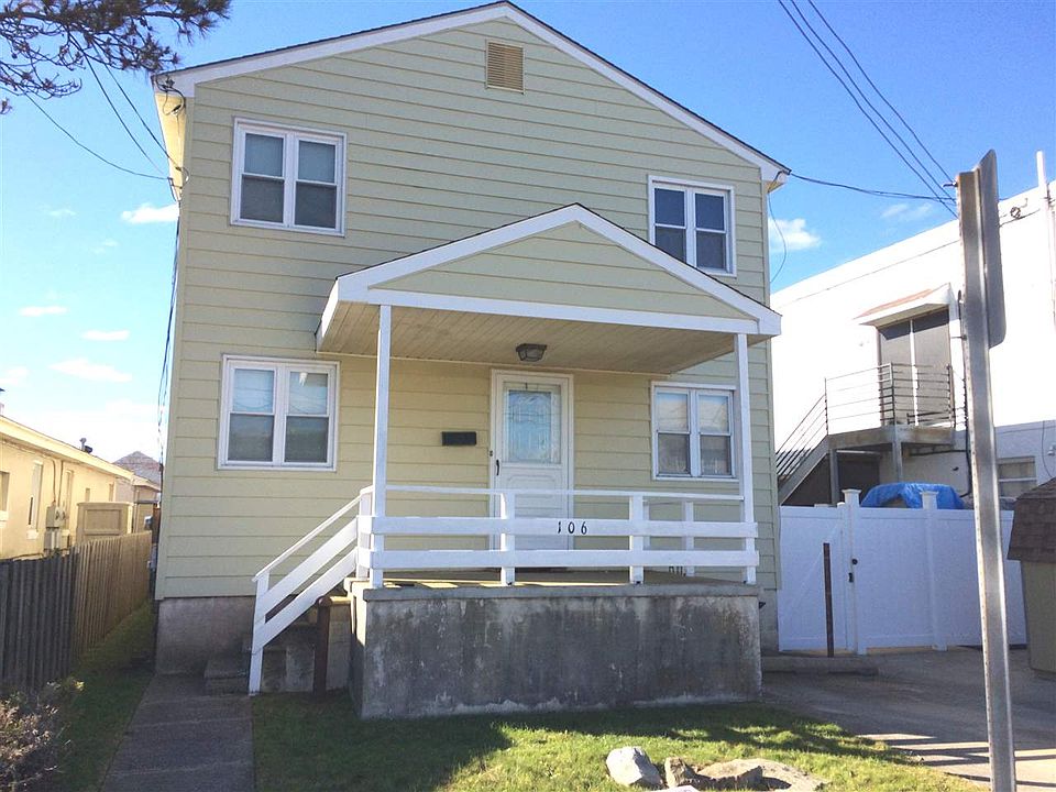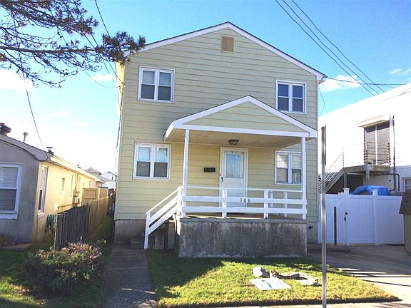 Single family house consisting of 4 bedrooms, 3 full baths, 2 kitchens, dining room, living room with brick fireplace, family room with brick fireplace, 1st and 2nd floor rear decks and a front porch. By closing an interior door this house can be used as a duplex. 3-zone gas hot water bb heat + gas hot water. This building is elevated. Fenced in rear yard has 2 storage sheds. Driveway parking for 1 car. The city of North Wildwood has this property listed as a duplex. DO NOT USE THE REAR STAIRS LEADING TO THE 2ND FLOOR. DANGEROUS.