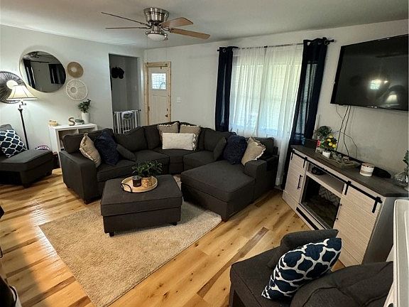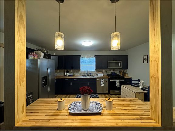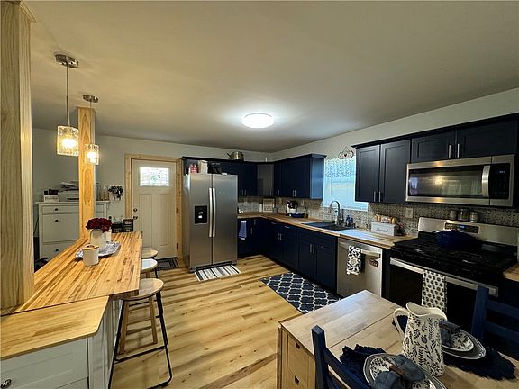 MOVE RIGHT IN TO THIS ALMOST BRAND NEW HOME..... Home was taken down to the studs and completely renovated in 2023, to include all new wiring, plumbing, HVAC, insulation, drywall, metal roof, vinyl siding, new interior and exterior doors, new wrap around front porch. This beautifully designed home features an open concept eat in kitchen/living area featuring solid wood navy blue cabinetry, butcher block countertops, beautiful ceramic tile backsplash, and stainless steel appliances. 1st floor Master Suite, with large closet, full bath with walk in shower, and tile surround. Additional first floor bedroom, and full hall bath with ceramic tile surround and flooring. Luxury vinyl flooring throughout main living area of 1st floor. On the second floor you will find 2 large bedrooms, with Vaulted wood plank ceilings, as well as a 1/2 bathroom. Basement has plenty of room for storage. Nice backyard, and off street parking. THIS IS A TRULY MUST SEE HOME!
