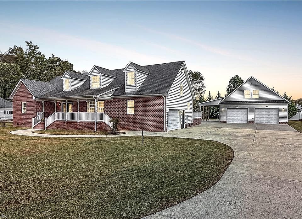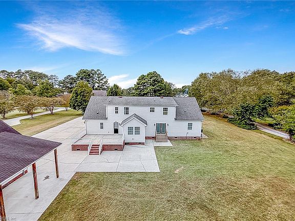 Discover this beautiful home just minutes from the VA-NC line! This spacious home welcomes you with a bright foyer opening to an airy family room and private office. The open kitchen features a center island with a new cooktop, granite countertops, custom cabinetry, built-ins, an eat-in area, and a formal dining space—great for gatherings. Enjoy LVP flooring throughout the main level and new carpet upstairs. The thoughtful layout includes a main-level primary suite plus two additional upstairs suites, great for guests or multigenerational living. A large FROG offers flexible space for a theater, gym, office, or playroom. The detached garage provides 1,300 sq. ft on main level for cars, storage or hobbies. A 533 sq. ft. studio with a full bath and kitchenette—great for guests or rental income. With septic in the front, the backyard offers plenty of usable space. Located 2 miles from border, local shops, farm markets, and just 55 minutes to OBX. Call today!