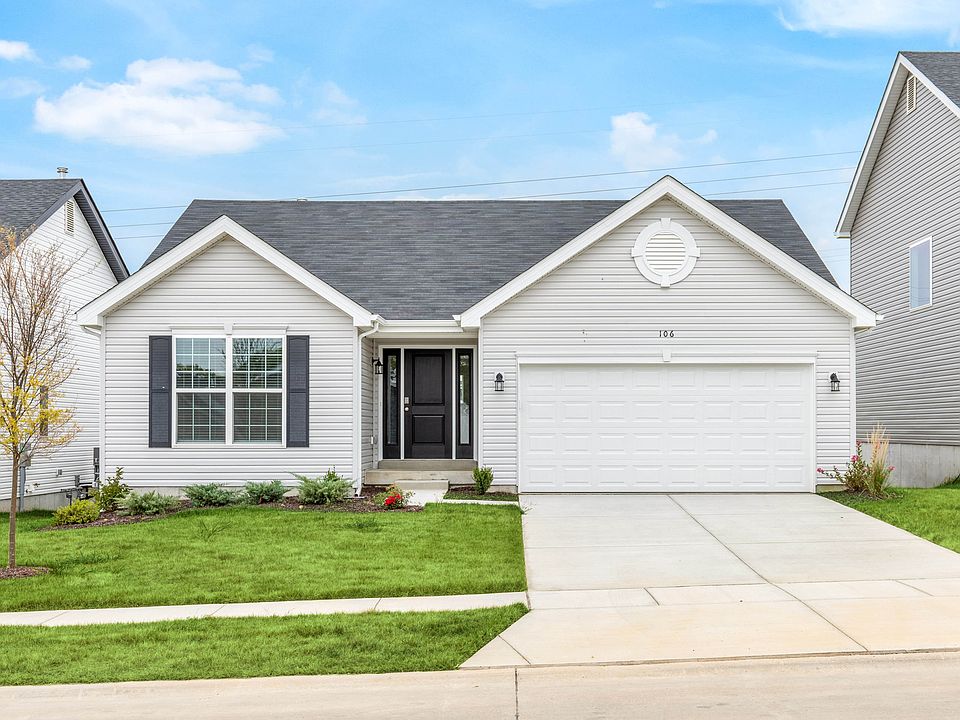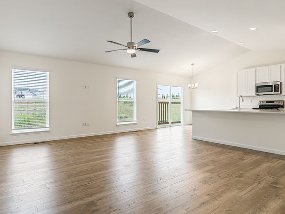 Be the very first to call this brand-new home yours! This never before lived-in 3 bedroom, 2 bath ranch combines fresh modern finishes with a bright and open layout. The heart of the home is the stylish kitchen, complete with quartz counters, stainless steel appliances, custom cabinetry, and a large eat-in peninsula that flows seamlessly into the dining and living areas. Vaulted ceilings, recessed lighting, and luxury vinyl plank flooring add to the fresh, airy feel. The primary suite offers a spacious retreat with a 6x4 walk-in closet and a private en-suite bath featuring a dual vanity and walk-in shower. Two additional bedrooms share a full hall bath with a comfort height vanity and shower/tub combo. Enjoy the convenience of a main floor laundry room, a 2 car oversized garage, and a backyard ready for your personal touch. Located in the desirable Harvest Manors community, you'll have access to future amenities including a play area with water feature, 13+ acre town square, food truck court, orchards, pumpkin patch, community gardens, pickleball & bocce ball courts, playgrounds, trails, and more! Don't miss this opportunity to enjoy a brand-new home in a thriving new community, just moments from popular shopping and dining.