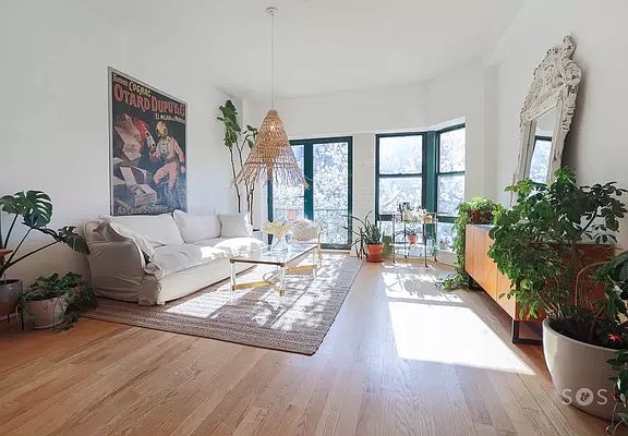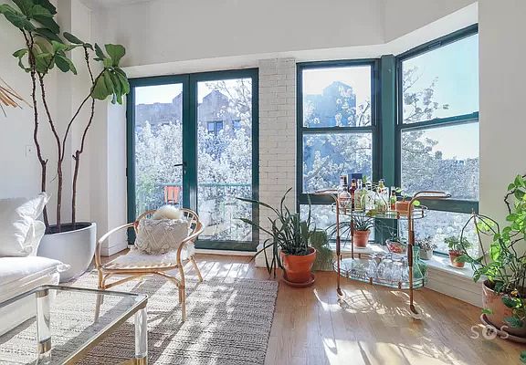 For those who are keen on loft living 7C offers everything you could wish for in a home. From it's tall 10 foot ceiling to a floor-through layout, the condo feels expansive. Upon initial entry you will notice how its' floor plan lends itself to a wide variety of uses and furniture placement. To the right is an oversized living space, well proportioned to fit a 6 or 8 person dining table besides large living room furniture, plants, and artwork. From this position tree tops dressed with white blossoms and green leaves fill the windows, and a double door leads to a private balcony to enjoy the view. Placed in the loft's center is a kitchen with a large island, perfectly situated for entertaining guests. At the home's rear is a gracious sized space with two double windows facing westward. At about 18 feet wide, a division could quite easily convert this open space into a 2 bedroom home, with a master bedroom and a second room ideal for a child or at-home work space.