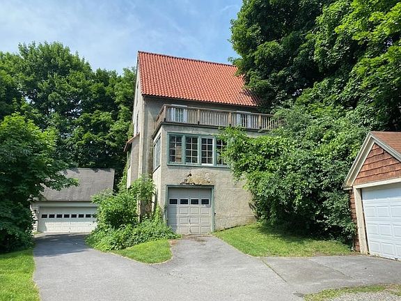 1910 Stucco house with red tile roof, on Cornell land lease lot in Cornell Heights Historic District. Land lease $293.11/mo. Near pedestrian suspension bridge, under 10 minute walk to Cornell Arts Quad with bus at the corner. Nice details: french doors, leaded glass book cases and wood-burning fireplace with mantle in livingroom, glass door knobs, ornamental mantelpiece in primary bedroom. Two larger bedrooms let out to 2nd story porch over the 10x27 sunporch. Small finished room in basement with non-functioning bathroom. Shared driveway off Fall Creek Drive - one parking space in front of garage. The house needs a lot of work, outside and inside. It is a mess and being sold "as is" with all contents in place. Price reflects condition. It requires a CASH purchase. The listing agent is the seller.