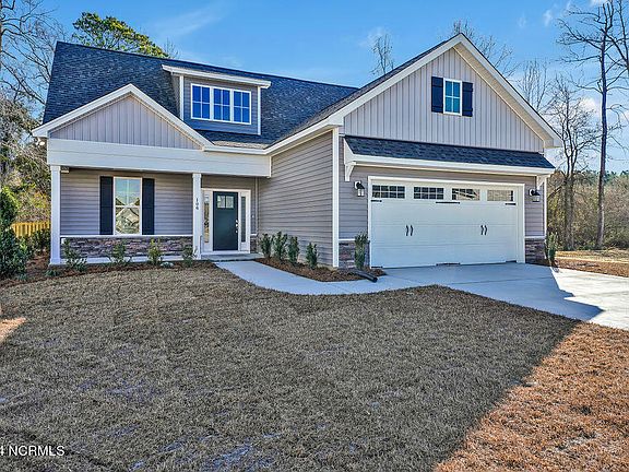 Welcome to the Creekside plan by Hardison Building in the Creekside subdivision. This is a 3 bedroom, 2.5 bath, open floorplan with the primary suite downstairs and a covered back porch where you can enjoy relaxing while looking at the private, wooded view of the back yard. There is an open kitchen with an island and a peninsula with quartz countertops. Cabinets include soft close drawers and doors, stainless steel appliances include a range, dishwasher and microwave. The kitchen and dining are open to the living room with an abundance of natural light and a gas fireplace with shiplap wall and upgraded trim throughout. The laundry room and half bath are both downstairs. All upstairs bedrooms have carpet, bathrooms have ceramic tile and primary suite, loft and living areas have water resistant laminate flooring. Two bedrooms with a full bath and a loft (perfect for an office) are upstairs. Yard is fully sodded with irrigation and a retaining wall with rear fence. Located near downtown Burgaw and I-40 with a short commute to Wilmington the location is hard to beat! This home is move in ready.