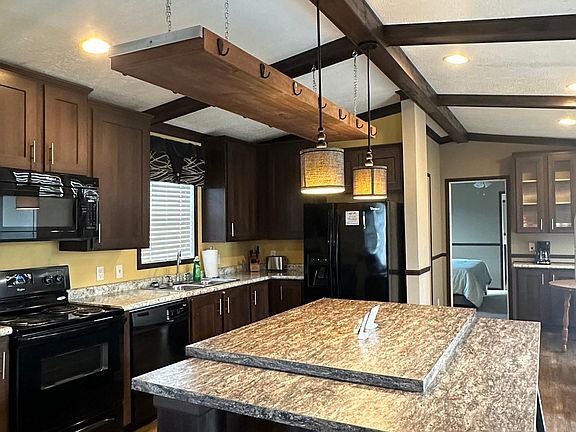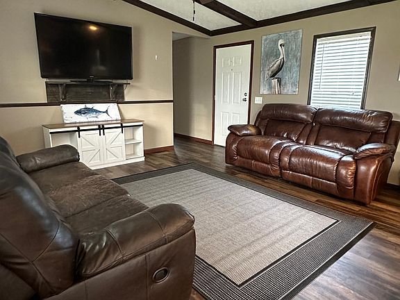 3 Bedroom, 2 bathroom trailer with washer & dryer in laundry room. The living room has two oversized couches with 4 reclining seats, a large flat screen tv, and opens to the full-size kitchen with bar seating and dining room table. Outdoors is a large secure front deck with propane grill.