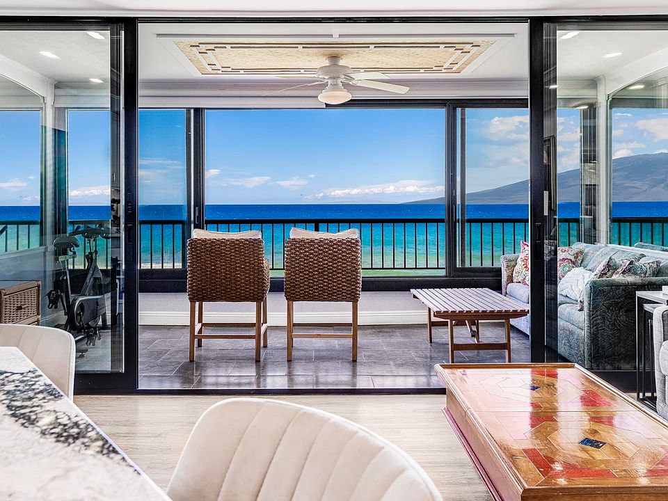 This beautifully remodeled oceanfront one bedroom, one bath condo with over 150 sf of lanai space, immerses you in stunning panoramic ocean views from nearly every angle. Thanks to thoughtfully placed mirrors, the sparkling blue sea seems to surround you wherever you look. Extensively remodeled in 2020 and beyond ~ Enjoy a sleek, modern kitchen with granite countertops, luxury vinyl flooring, and stainless steel appliances, complemented by recessed lighting and new furnishings throughout. Relax in cool comfort with brand new airconditioning and unwind in your tastefully updated bath. The tranquil bedroom with Tempur-pedic king size bed, offers a rare peekaboo mountain view for the perfect finishing touch. Hotel zoned with an impressive rental history and countless 5-star reviews. At Maui Kai 405, every detail is designed to bring the beauty of Maui’s shoreline right into your daily life, making this retreat blissfully unforgettable.