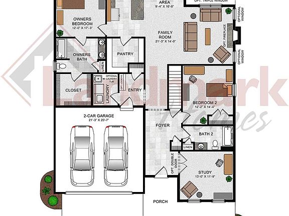This modern one-story home features 2 bedrooms and 2 full baths with a study to the front of the home.. The kitchen, well-equipped with a spacious pantry, opens to the a family room with an option for a fireplace. The owner's suite offers plenty of room and comfort with a private bathroom and an oversized closet. (Pricing may reflect limited-time savings/incentives. See Community Sales Manager for details.)