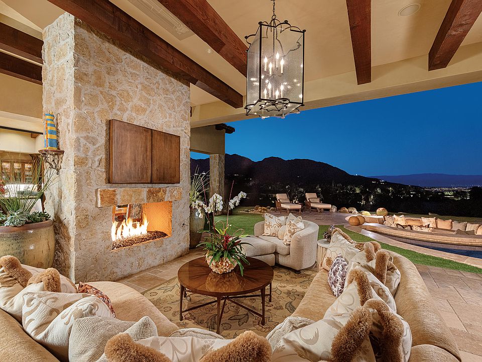 Welcome to one of the most dramatic views in BIGHORN, with unrivaled down-valley, golf course and mountain views from your elevated outdoor living and dining rooms. Perched above the Canyons 2nd fairway, this romantic architecture offers some of the best indoor / outdoor living in the desert. The layout offers four suites inside the main residence plus two offices and a theater. There is also a separate-entry guest house with morning bar. Four full car garage plus a two-cart garage off the master wing. Pocketing walls of glass spread across the living room, dining room, wet bar, kitchen and master suite for a seamless transition outside. The outdoor living includes a two-sided fireplace with TV's, soft seating and dining, sunken fire pit with built-in seating, all with views of the pool, spa and the valley below. Outdoor cooking with granite counters and built-in BBQ are easily accessed from kitchen. Low maintenance landscaping with artificial turf and sculptural desert plantings. Offered furnished, excluding artwork.