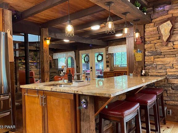 Unique surprises in this Storybook home tucked away from road. Grand Lodge entrance on huge Trex deck. 3 Bed +3 bonus rooms, 2 Bath. Glowing natural colors create warm vibes. A hand made ladder leads to a reading nook & many rooms offer a surprise space. Truly one of a Kind. Features; hand-stacked stone walls, fireplace, granite counter w/lepidolite, custom cabinets, wide plank floors, multi-level treehouse and a private cabin! Plus, an impressive waterfall/pond. AmaZing all the way around. Seller thought of every detail creating a playful flair. Community Clubhouse Amenities: 1 Indoor Pool/2 Outdoor Pools, Hot Tub, Steam Room, Sauna, Tennis, Gym, Pickle Ball, Bocce, Hand Ball, Billiard, Ping Pong, Clubs, Parks, Beaches, 3 Lakes, Hiking trails Etc., Beds Description: 1 BED 2nd, Beds Description: 1Bed1st, Beds Description: 1 BED 2nd, Baths: 1 Bath Level 1, Baths: 1 Bath Level 2, Eating Area: Dining Area
