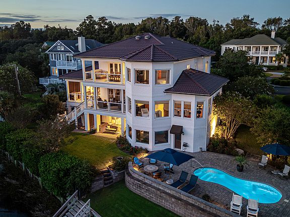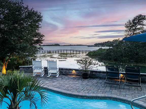 Located down a private lane lined with live oaks, only 9 homes are part of this sought after waterfront community of Popular Grove Point off Scotts Hill Loop Road. The privacy and attention to detail will sweep you off your feet when you enter this all brick coastal classic design featuring 5,782 square feet. The open floor plan features 10 foot ceilings and loads of glass to capture the south facing views looking over the coastal marsh and Intracoastal Waterway. Stunning Brazilian floors will greet you in a vaulted foyer with adjacent dining room that open to the great room, breakfast area and a spectacular chef's kitchen with large buffet serving bar, stainless steel side by side Viking refrigerator and freezer, Viking ovens and 6 burner gas cooktop. The all white kitchen features a farmhouse sink with triple windows that provide a bright, sunny space for family gatherings and elegant entertaining. The first floor has a large master suite with updated spa like bath and walk in closet with custom built-in closet shelving. Upstairs you will find a second waterfront master suite and 2 other bedrooms each with bath ensuite. A large covered porch (23X12) provides the perfect spot for morning coffee or watching the wild life of this special coastal estuary. With an elevator serving all 3 floors, you can enjoy the lower level of this home with its' massive entertainment room (34X16), full bath, gym and 2 car garage. Off of this great entertaining level is an expansive paver area with salt water pool. Not to be forgotten is the dog bathing and grooming area! A whole house generator is fueled by diesel and the 50 year metal roof is designed to withstand 150 mile per hour winds. A short stroll takes you to the community pier, rebuilt in 2024, with a dedicated 30 foot slip and 12,000 lift. If you are looking for views, you just found it. If you are looking for it all, you just found it!